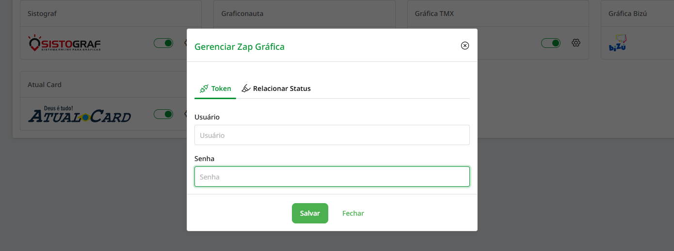 Clique no icone “engrenagem” e gere seu token e copie. Aproveite já configure o status relacionalcionados.
