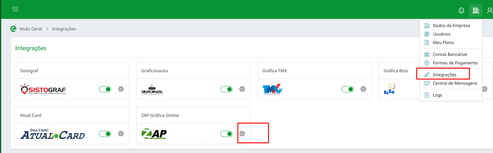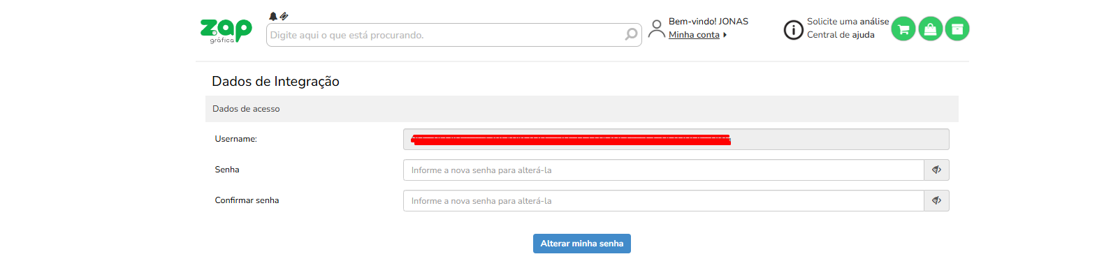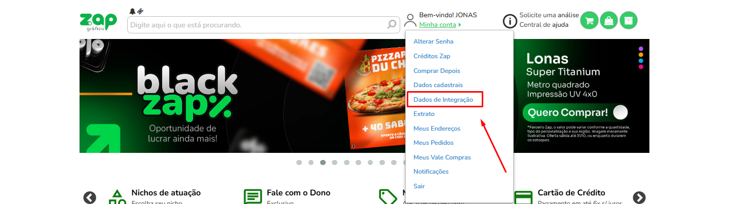 Acesse sua conta da ZapGrafica, clique em Minha Conta >> Dados de Integração