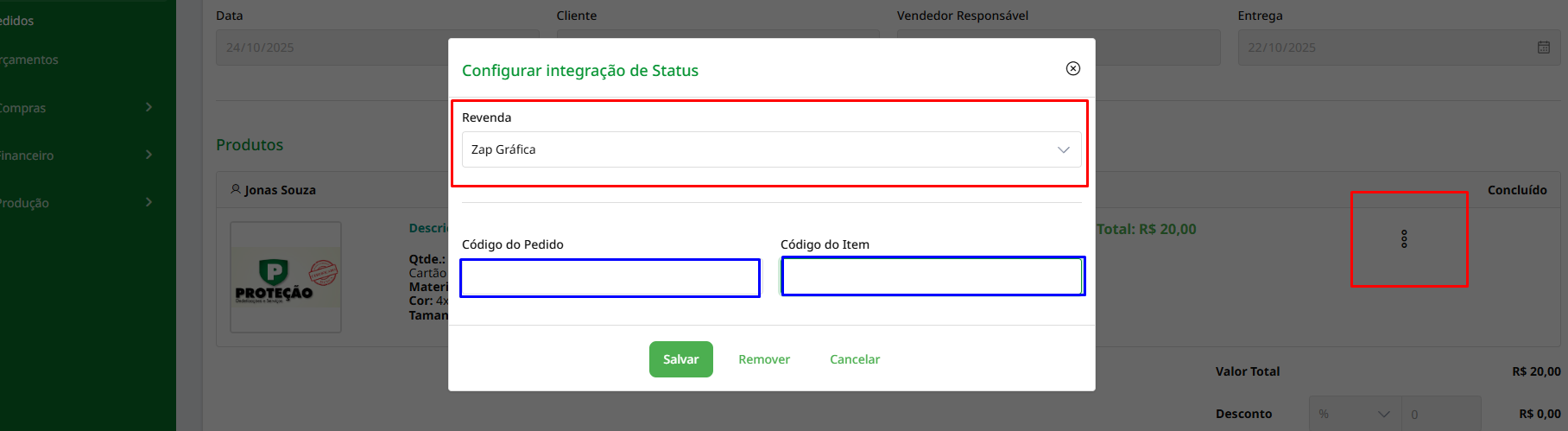 Uma vez configurada, após gerar o pedido, basta selecionar a opção “Integração de Status” dentro do item. Escolher a revenda, e inserir o numero item e salvar.