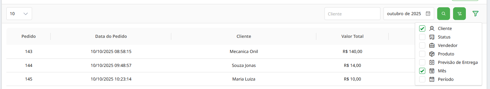 Mês: Use o filtro de mês para visualizar os pedidos de um período específico.