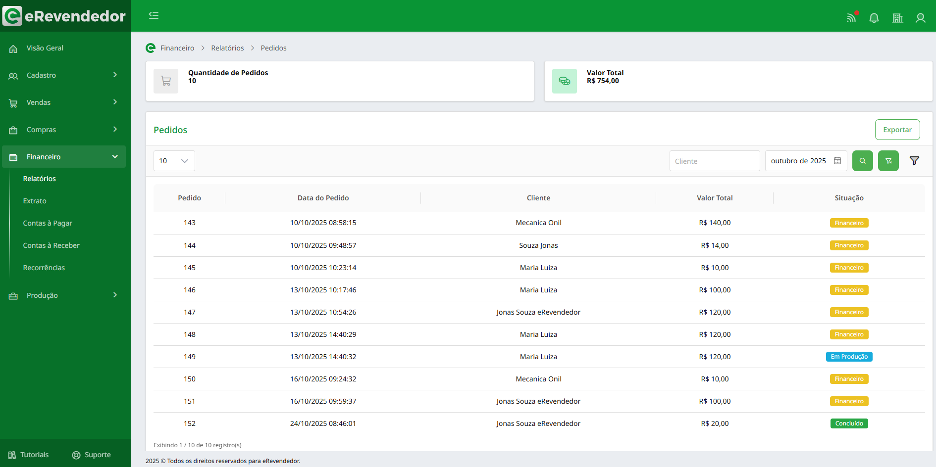 Com o Relatório de Pedidos do eRevendedor, você tem acesso rápido e detalhado ao histórico de vendas, podendo filtrar, consultar e exportar os dados com facilidade. Isso ajuda a ter uma visão clara do desempenho do seu negócio.